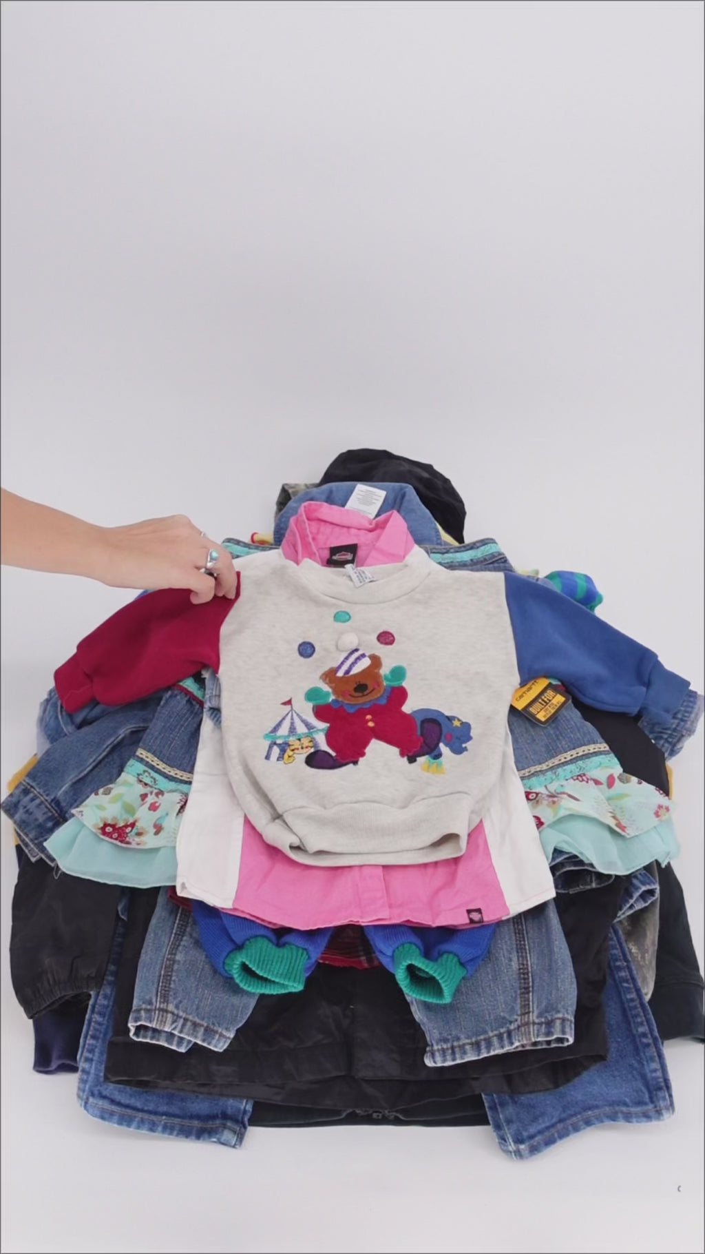 This Kids' Vintage & Modern Mixed Clothes Box is filled with every era and every kind of children's clothing, with many pieces from the Y2K era. In each randomly assorted bale you'll find branded pieces like Carhartt, Harley Davidson, North Face, Columbia, Wrangler, Levi's, Calvin Klein, Osh Kosh B'Gosh, and more! Plus items with animated characters like Disney, Marvel, DC Comics, etc; and a sprinkling of true vintage from the 1950s-1990s. This mix is a sampling of what we see coming through our warehouse - with nothing taken out except items with condition issues.